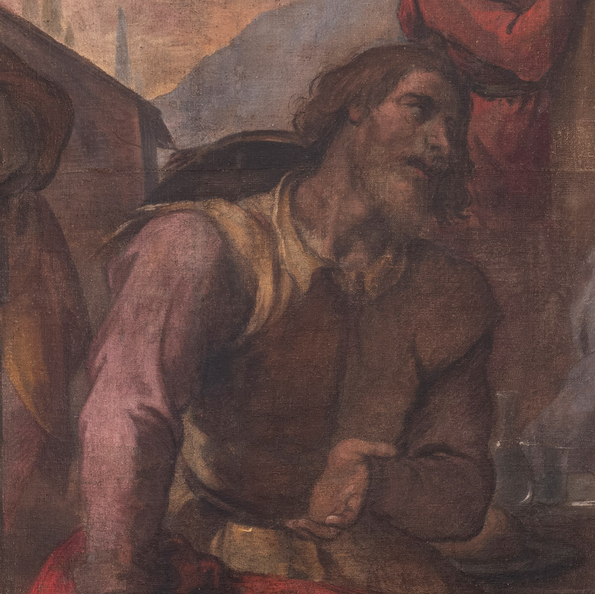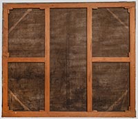 I due teli centrali sono tessuti con un filato grossolano di canapa di densità 7x7 fili /cmq, mentre i teli inferiore e superiore sono tessuti con filato di lino di titolo molto più sottile e con una densità di 12x9 fili/cmq. Sui due teli centrali si riscontra la presenza di fili e nodi estrusi sia al verso che al recto. L'osservazione del verso della tela mostra la traccia degli elementi strutturali del telaio originale, quali la rompitratta longitudinale ed i quattro rinforzi angolari, evidenti per l'impronta sul filato originale nudo, non imbevuto dalla sostanza scura spennellata sul retro quando il telaio originale era in essere.