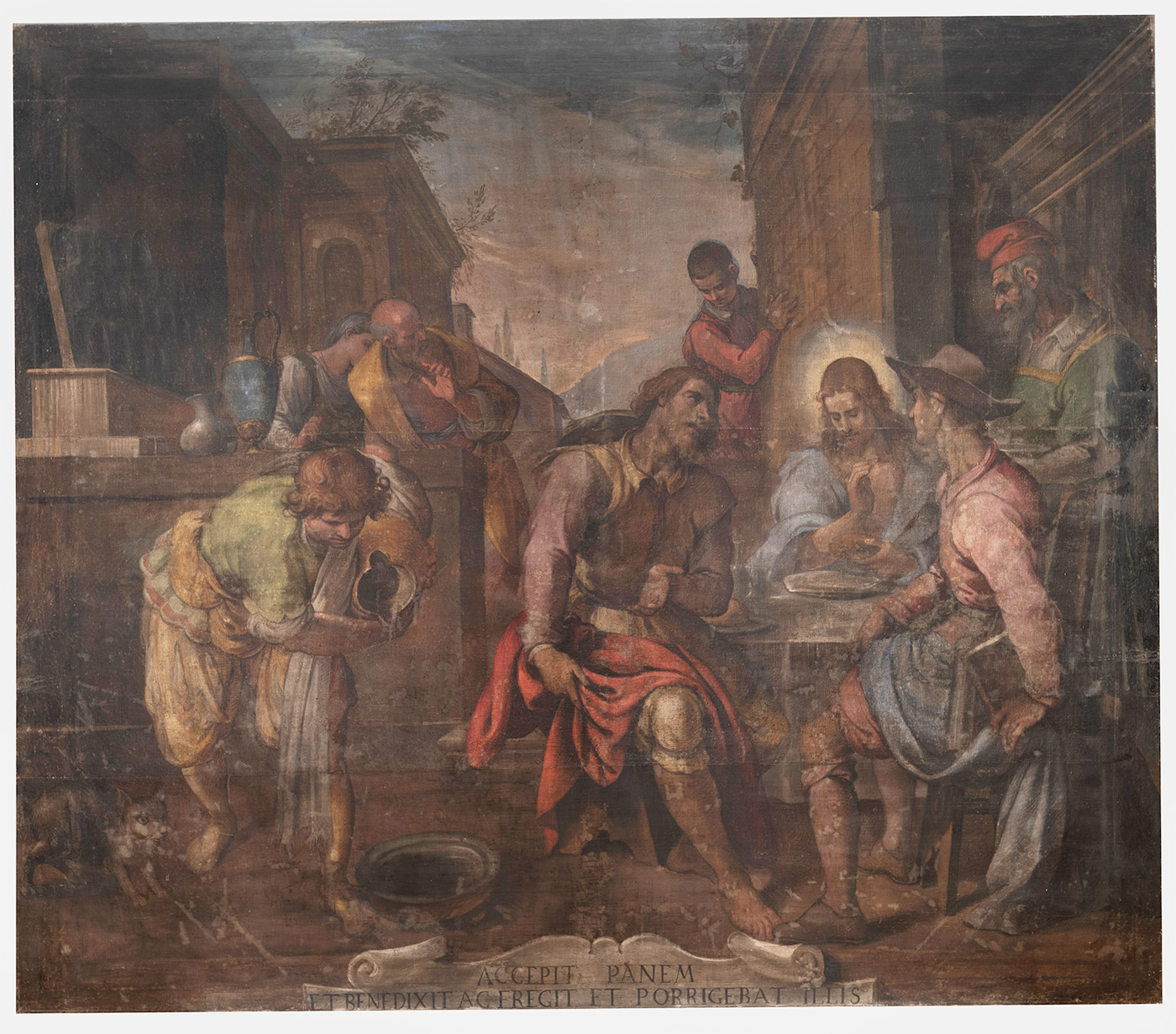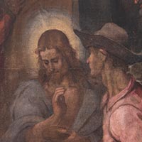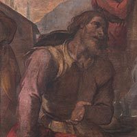 Riguardo ai pigmenti utilizzati dal Poccetti, è stata analizzata una stesura gialla costituita da giallo di Piombo e Stagno che risulta stesa in strato sottile sulla preparazione intonata di colore beige. Una pittura quindi realizzata con l'intento di simulare l'effetto visivo di un affresco, tramite l'utilizzo di pigmenti dalla tonalità accesa miscelati ad un legante magro, stesi su un fondo chiaro. Lo spessore ridotto dello strato preparatorio probabilmente è stato pensato per non appesantire il supporto, come detto, di dimensioni considerevoli. Questa caratteristica tecnica ha certamente contribuito alla conservazione dell'opera che tutt'oggi è ancora in prima tela e mantiene pressoché inalterata la sua struttura, ma, da un altro lato, ha favorito la perdita di luminosità delle campiture pittoriche imbibite dai materiali consolidanti applicati nei diversi interventi di manutenzione e restauro che si sono succeduti nel tempo-vita dell'opera e che hanno causato l'alterazione cromatica del filato e degli strati pittorici.