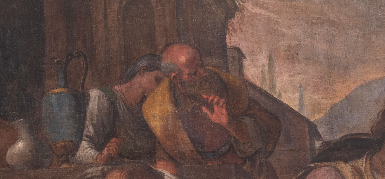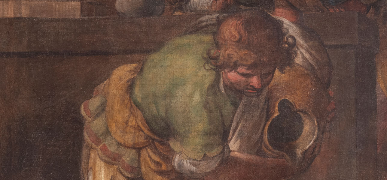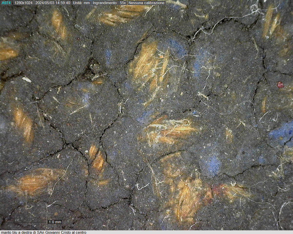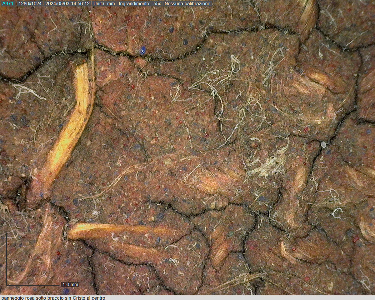 La preparazione è stesa in modo disomogeneo, probabilmente trattenuta già originariamente in maniera differente dai diversi filati: sulla tarmatura rada in alcune zone è passata sul retro (foto 5) e generalmente ha lasciato quasi scoperti i nodi; sui teli posti in basso e in alto, nonostante il tessuto sia più serrato, la stesura appare comunque non uniforme. (cfr. foto al microscopio digitale 1-4) Le analisi chimiche e stratigrafiche eseguite su microprelievi da ADAMANTIO srl per l'identificazione dei materiali costitutivi della pittura “hanno identificato una struttura pittorica relativamente semplice composta da uno strato preparatorio di colore marrone chiaro a base di carbonato di calcio e terre ed un secondo strato più superficiale con funzione pittorica. […] La pirolisi ha inoltre rilevato i marker di una probabile cera sintetica, di colle animali e di un derivato del colesterolo. Quest'ultimo permette di ipotizzare l'utilizzo di uovo anche se, l'assenza di altri marker specifici, non consente di confermarlo con certezza. Questa ipotesi sarebbe compatibile con un avanzato degrado della matrice organica” (cfr. relazione Adamantio n.46/b 2024 pag. 5/20).
