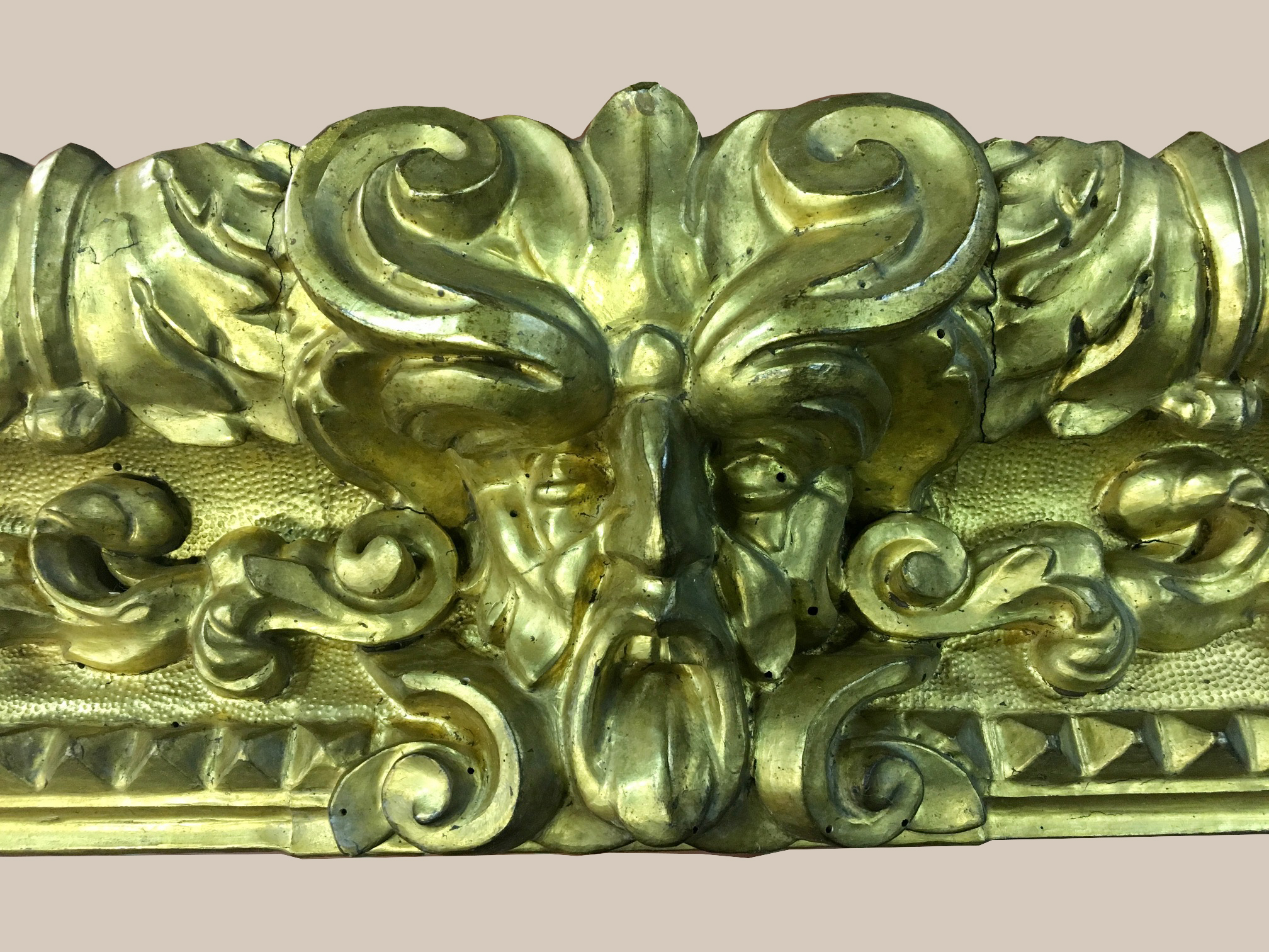 Particolare di una cornice intagliata e dorata in oro zecchino, di epoca cinquecentesca, con mascheroni, volute e festoni aggettanti, bulinatura al centro e punte di diamante o piramidi alla battuta.