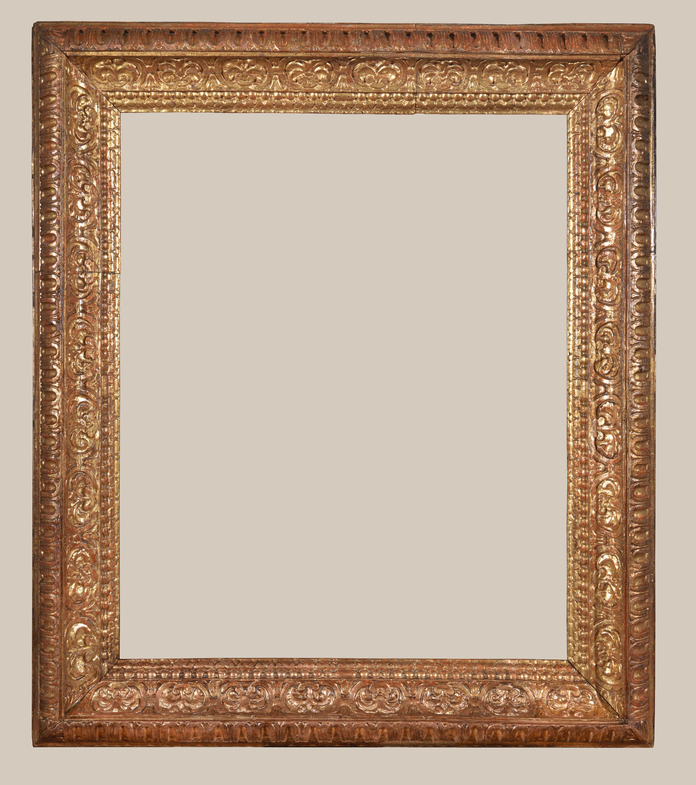 Cornice intagliata e dorata in oro zecchino di epoca seicentesca, con quattro ordini di intaglio. Unghiature al profilo, foglie e fiori al centro, alla battuta perline e sottofoglie.