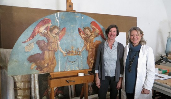 La lunetta nei laboratori di via del Ronco con Lesley Stevenson Chief Restorer della National Gallery di Edimburgo