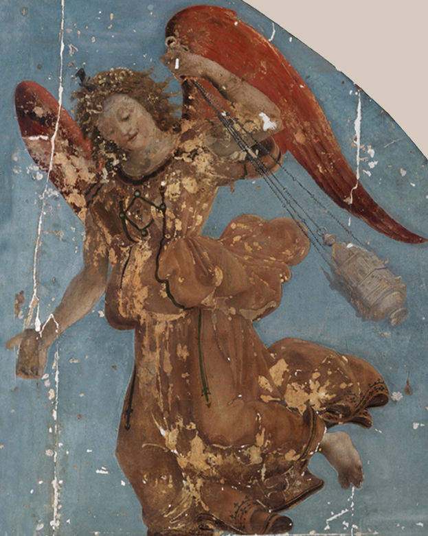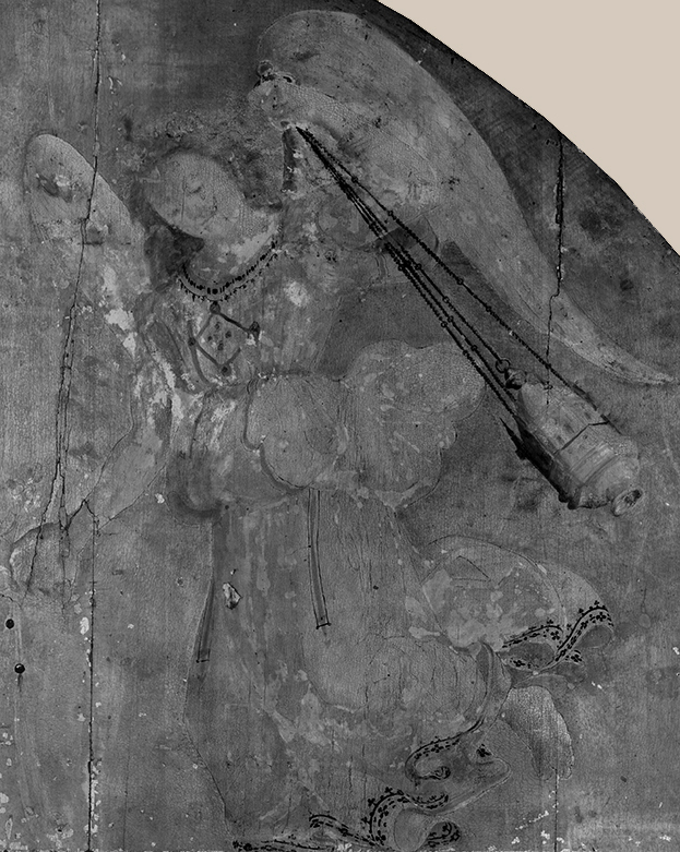 Particolare durante il restauro, a luce visibile e in IR scanner (infrarosso)