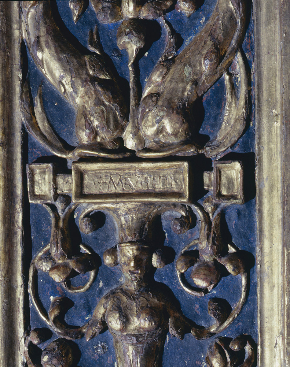 Antonio Barili, cornice intagliata dorata e dipinta, particolare della lesena sinistra con la cartella della data di esecuzioneParticolare della cornice intagliata dorata e dipinta
