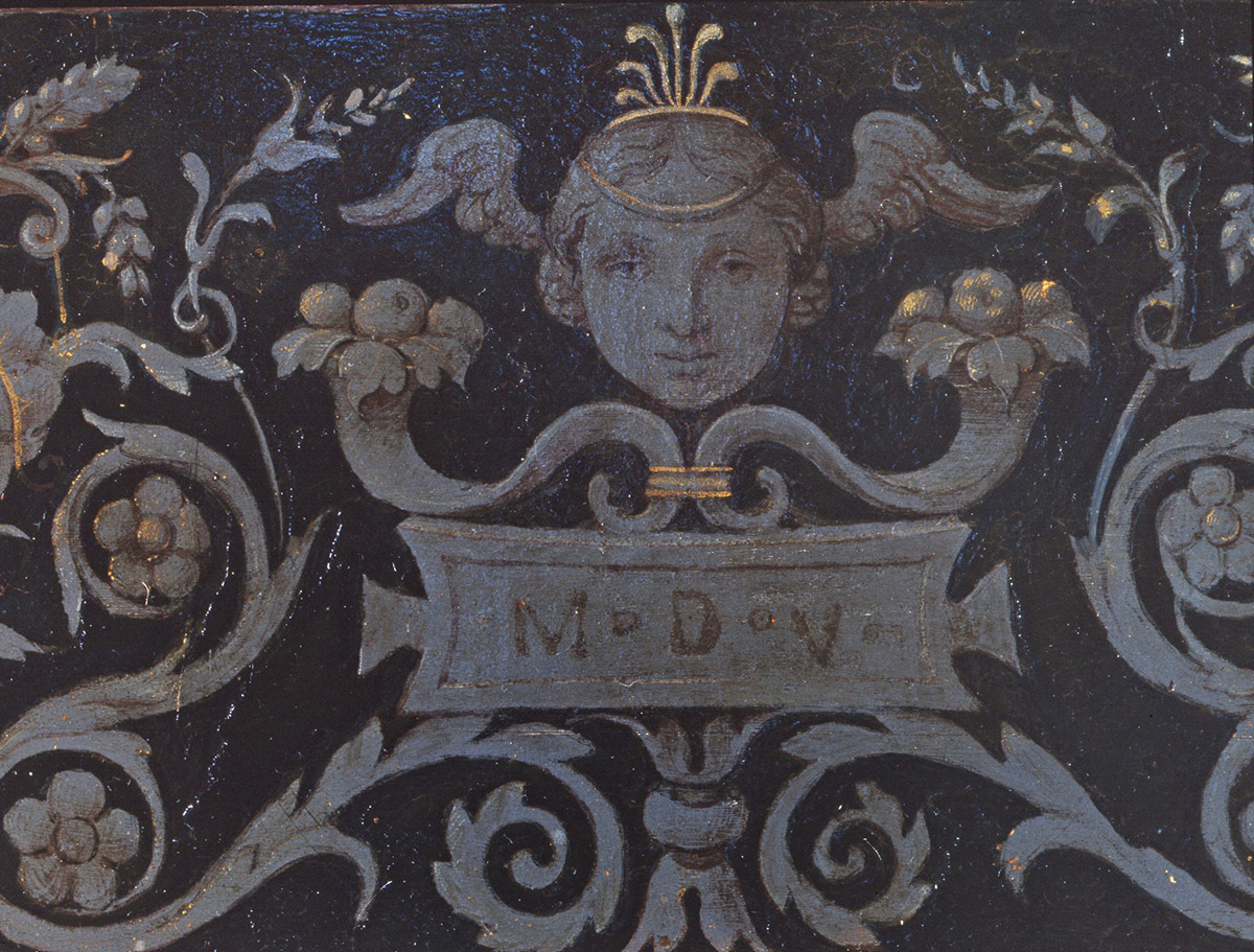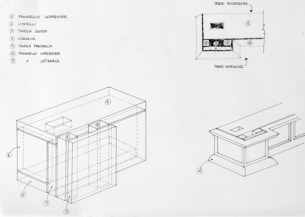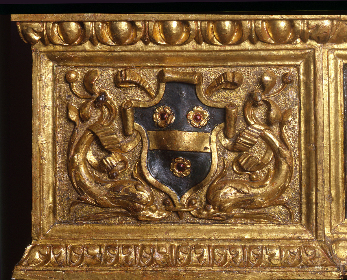 Antonio Barili, cornice intagliata dorata e dipinta, particolare del piede della lesena con lo stemma Segni
